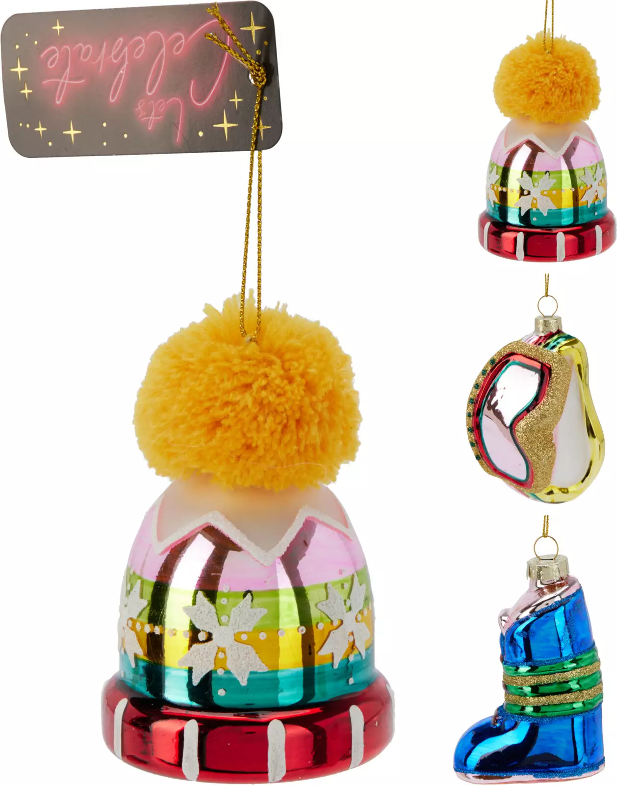 Färgglad juldekoration i glas SKI – glansig vinterdekoration med gyllene upphängningsband