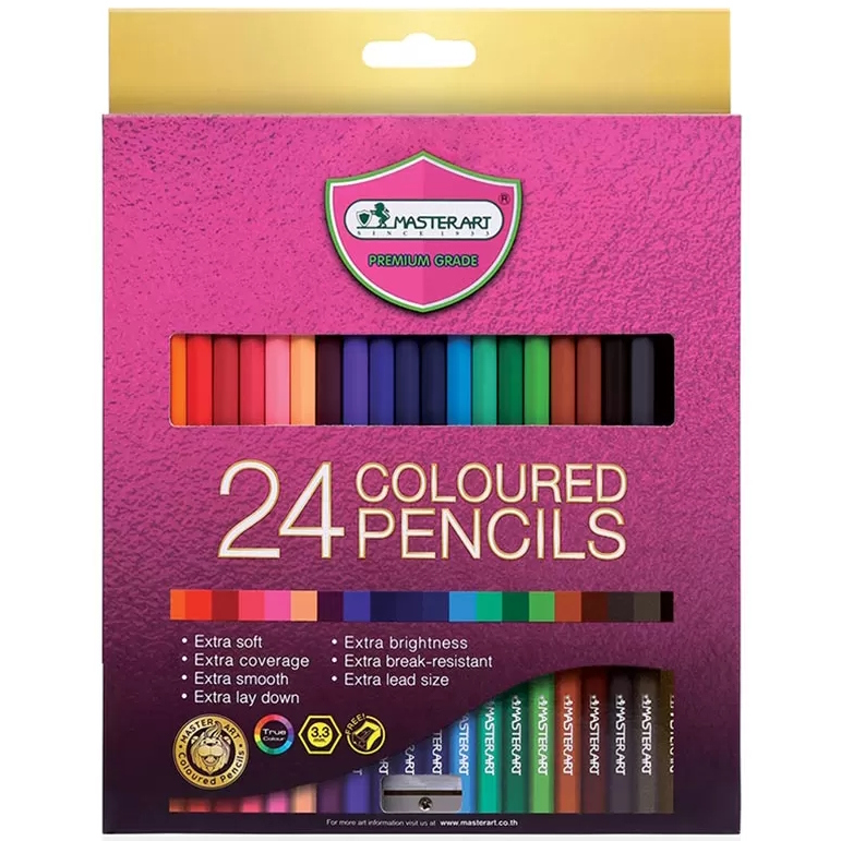 MasterArt-seriens färgpennor gör teckning och färgläggning till ett nöje. Denna förpackning innehåller 24 högkvalitativa färgpennor med ett fylligt och mjukt pigment som ger utmärkt färgåtergivning och hållbarhet. Pennorna sprider sig lätt och syns tydligt även på mörk kartong. Det sexkantiga träskaftet ger ett bekvämt grepp, och pennorna är lätta att vässa till mycket skarpa spetsar. En pennvässare ingår för att hålla pennorna redo för användning. Pennorna är tillverkade av FSC-certifierat trä, vilket säkerställer att de är framställda på ett hållbart sätt.