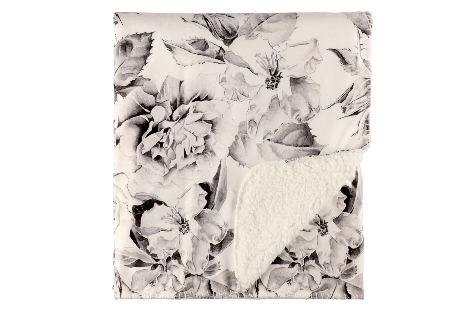 Mjuk och varm mysfilt med ett vackert blommönster. Ena sidan av filten är tryckt sammet och den andra halvan är vitt mjukt sherpahår.