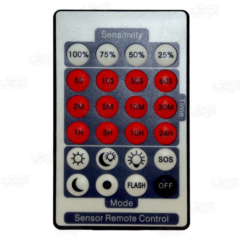 - Fjärrkontroll för: 10W, 20W, 30W, 50W och 100W Lexxa Slim-Line rörelsedetektorer.