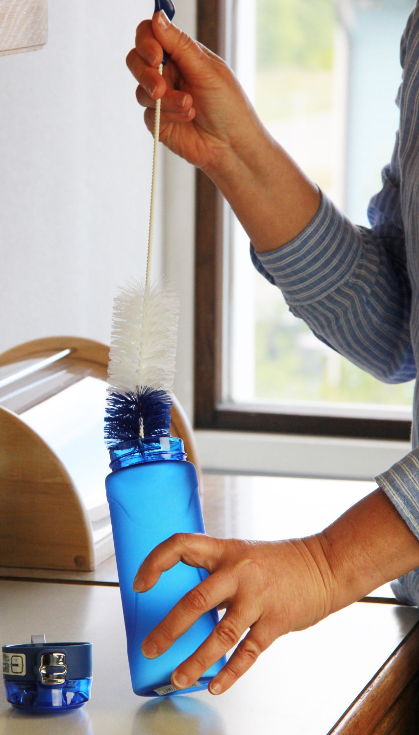 De blå och vita nylonborsten på sulan gör rent flaskor i olika storlekar. Tack vare det långa handtaget och produkten kan även svåra föremål rengöras. Den stora hängkroken gör det enkelt att torka produkten efter användning.