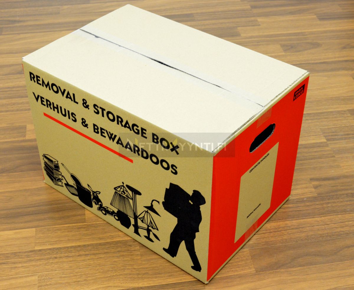 Fem stycken flyttlådor i kartong. Storlek 47,5 x 32 x 33 cm.