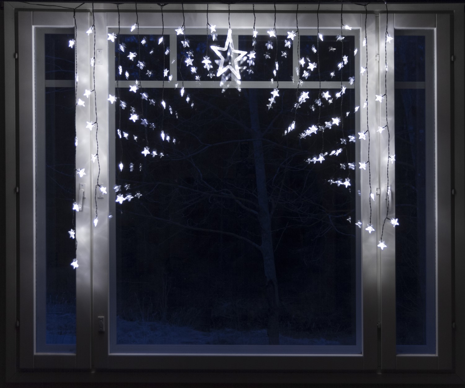 Vackra, stjärnhängda ljusstjärnor för fönster. Den gardinformade ljuskedjan är en imponerande stämningsskapare. I mitten av ljuskedjan finns en stor stjärna med 10 LED -lampor, dessutom finns det 70 små LED -stjärnor i ljuskedjan.