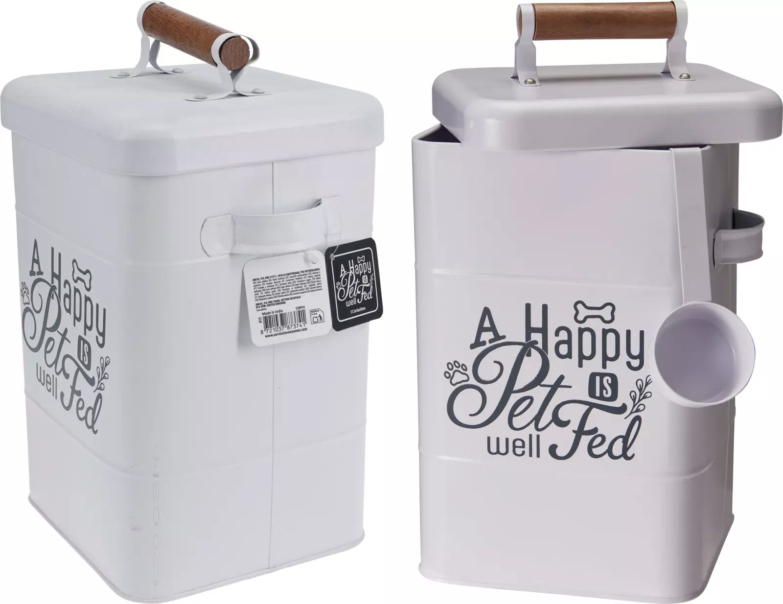 Håll djurets mat fräsch och köket snyggt organiserat med denna stilrena förvaringsburk för djurfoder. Burken är tillverkad i slitstarkt stål med en mycket ljus, nästan vitgrå yta som passar in i de flesta hem. Den dekorativa texten på framsidan – “A Happy Pet is well fed” – tillsammans med små motiv som tassar och ben, gör den till en charmig detalj även när den står framme.