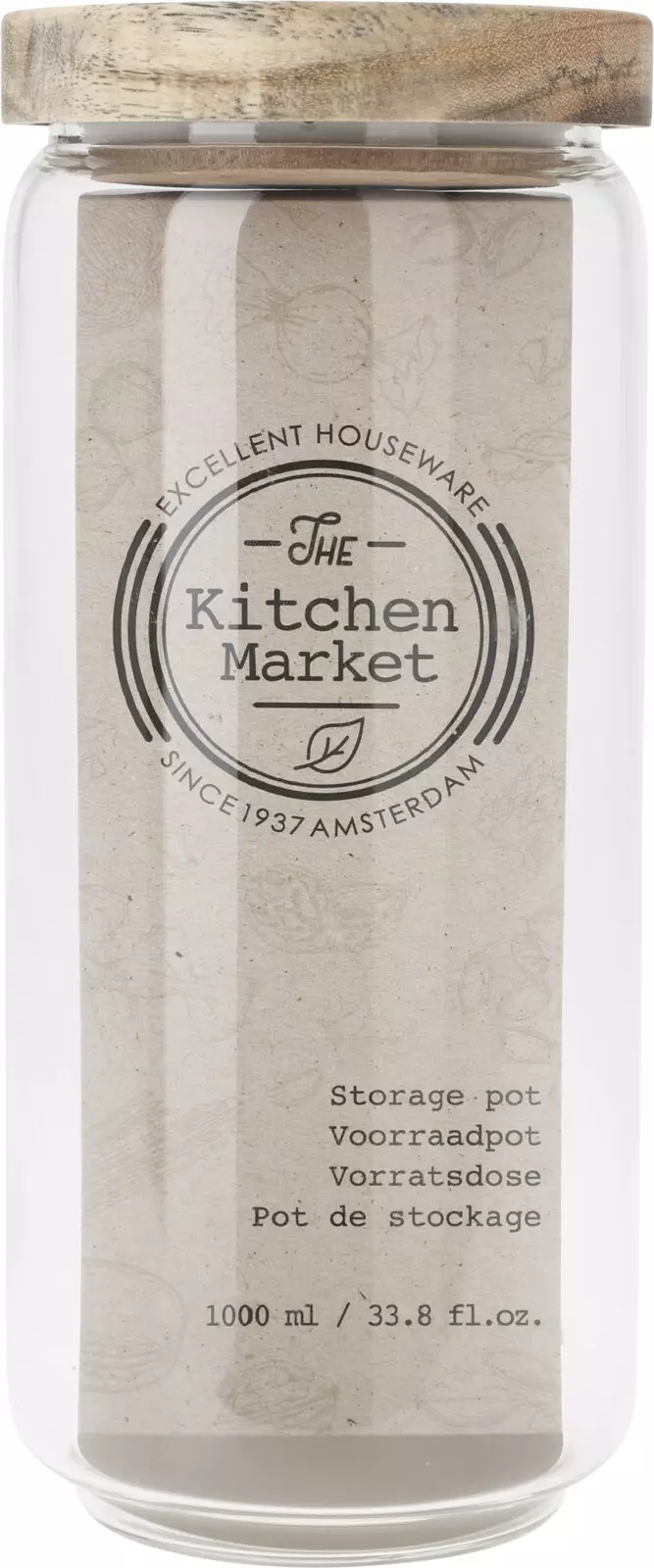 Elegant och hållbar 1000 ml förvaringsburk är tillverkad av högkvalitativt borosilikatglas och har ett vackert akaciaträlock. Burkens silikonring garanterar en tät förslutning, vilket håller livsmedlen färska. Denna tidlösa förvaringslösning passar utmärkt i köket eller i vilket utrymme som helst där du vill förvara torra produkter med stil.