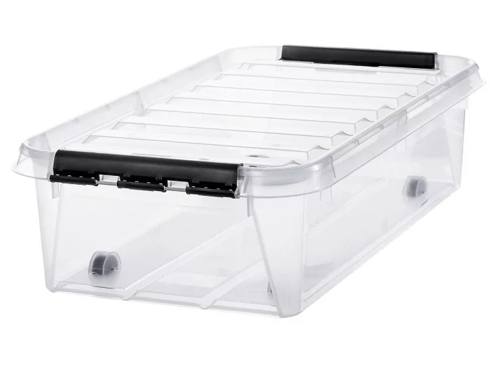 En låg och rymlig förvaringslåda som tack vare hjulen är lätt att rulla under sängen och ut igen. Perfekt för förvaring av till exempel kuddar, filtar eller vinterkläder. Kraftiga förslutningar håller locket tätt stängt. Lådorna staplas inuti och ovanpå varandra med lock. Hjulen gör det lättare att flytta lådan. Kraftiga förslutningar av återvunnen plast håller locket tätt stängt.