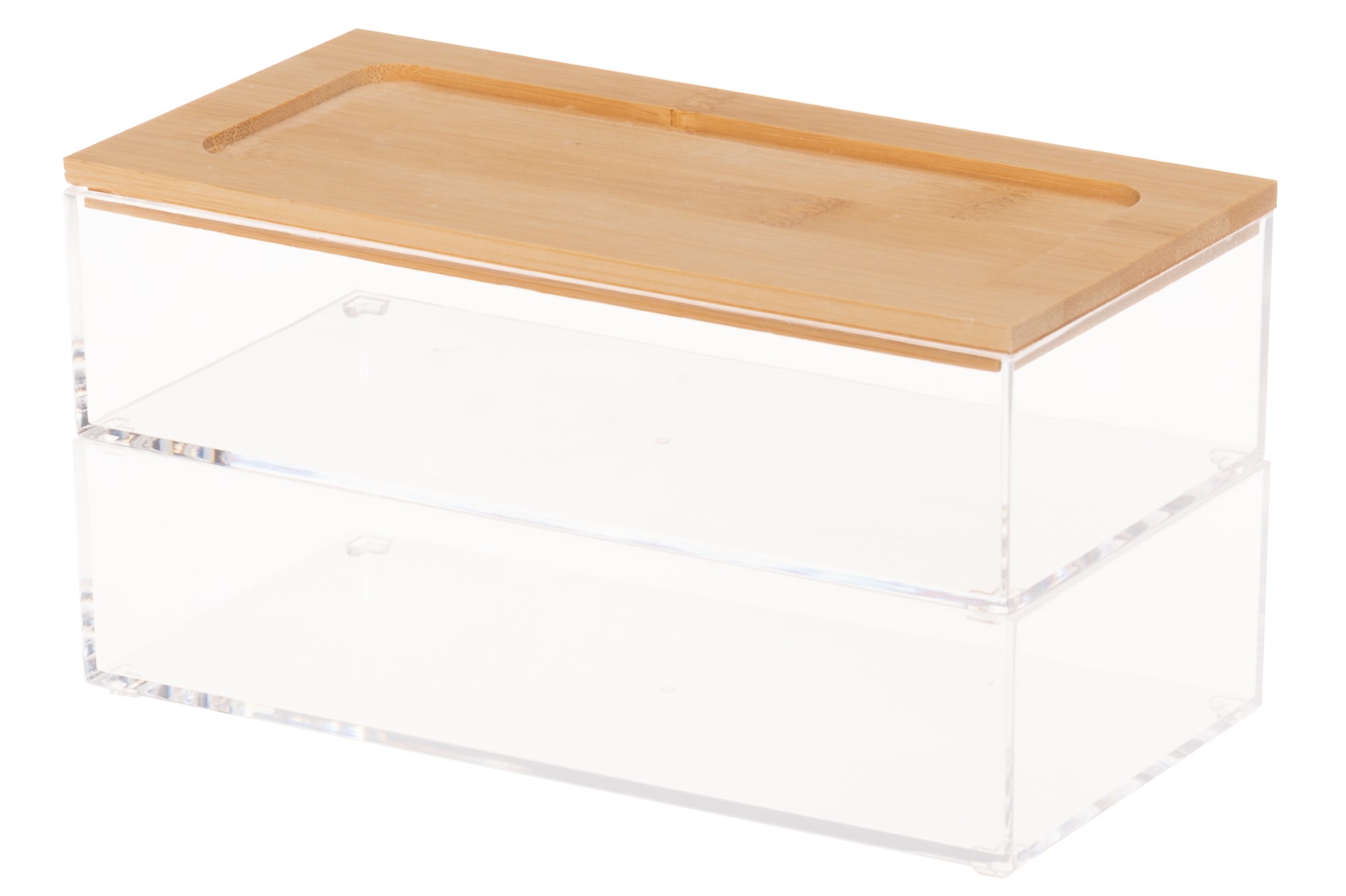 Den praktiska och multifunktionella förvaringslådan är gjord av klar plast, med bambulock och två nivåer.
