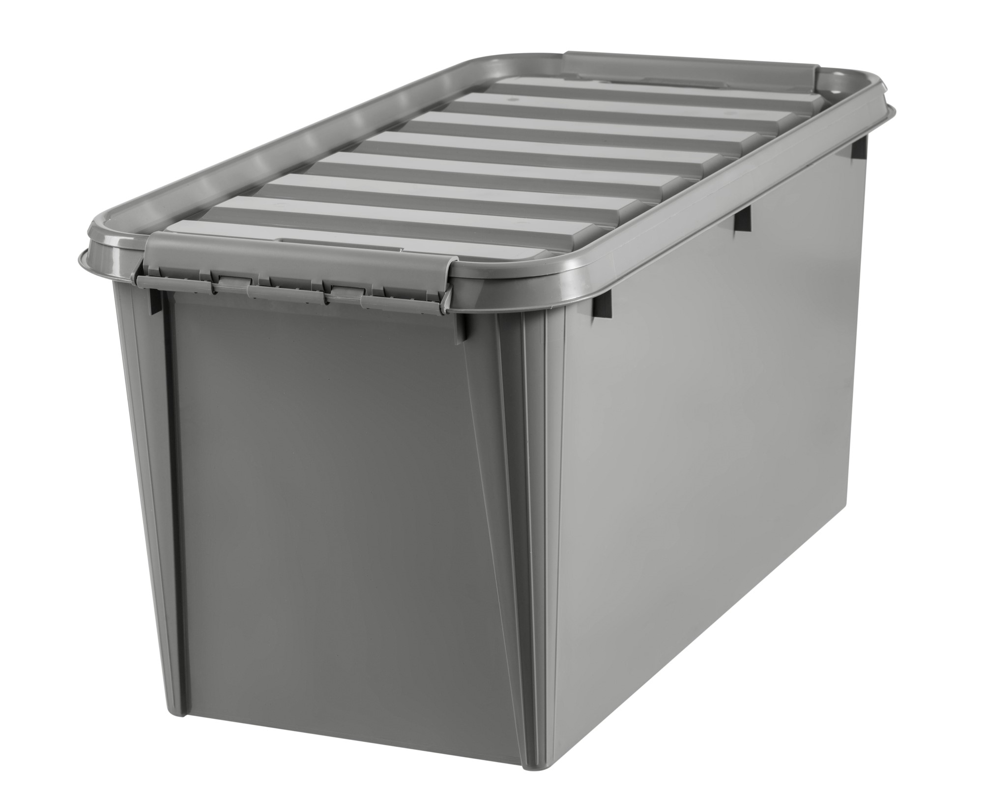 Förvaringslåda av återvunnen plast. En idealisk förvaringslåda för långvarig användning, till exempel i lager, källare eller garage. SmartStore™ Recycled 70 är optimal för förvaring av till exempel grillkol, påsar med blomjord, krukor, större ytterkläder samt sport- och hobbyutrustning. Hjulen gör att lådan kan flyttas även när den är full. Lådorna staplas inuti varandra utan lock och ovanpå varandra med lock. Rejäla förslutningar håller locket på plats.