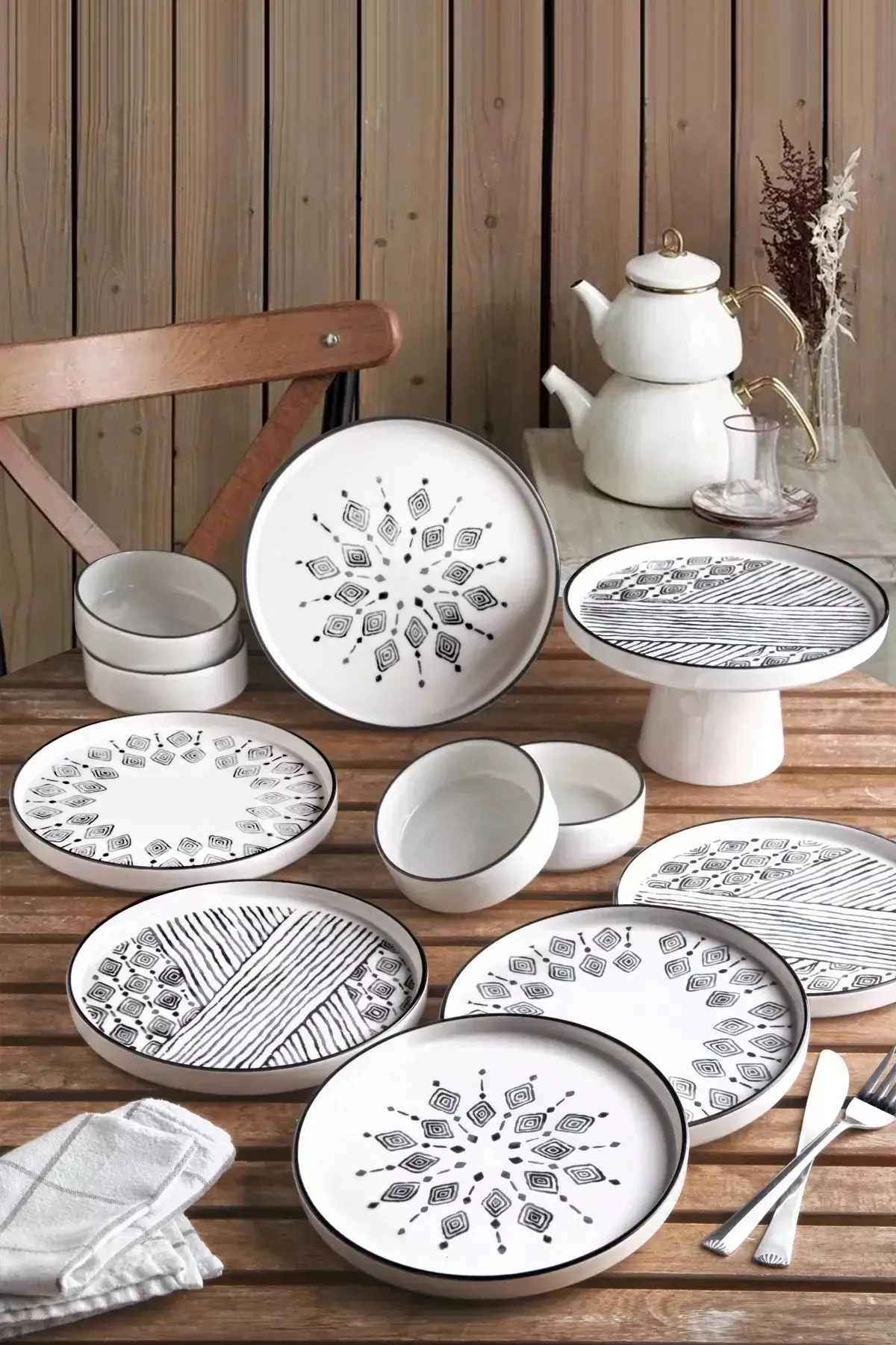 Börja dagen på rätt sätt med vårt frukostset i 11 delar, med 6 tallrikar, 4 skålar och ett stående presentationsställ. Den eleganta svartvita färgkombinationen ger en modern touch till din dukning, medan det högkvalitativa keramiska materialet garanterar hållbarhet och långvarig användning.