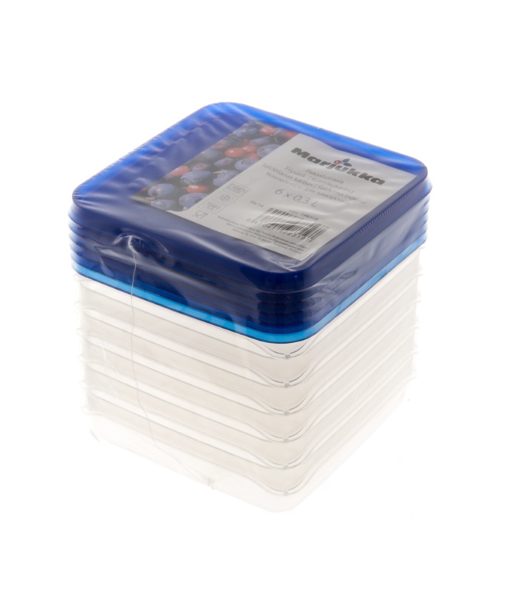 Frysbox tillverkad av livsmedelsgodkänd plast som tål mikrovågsuppvärmning och maskintvätt. Lådans volym är 0,3 liter. Förpackningen innehåller sex lådor med lock. Notera! mikrovärme utan lock.