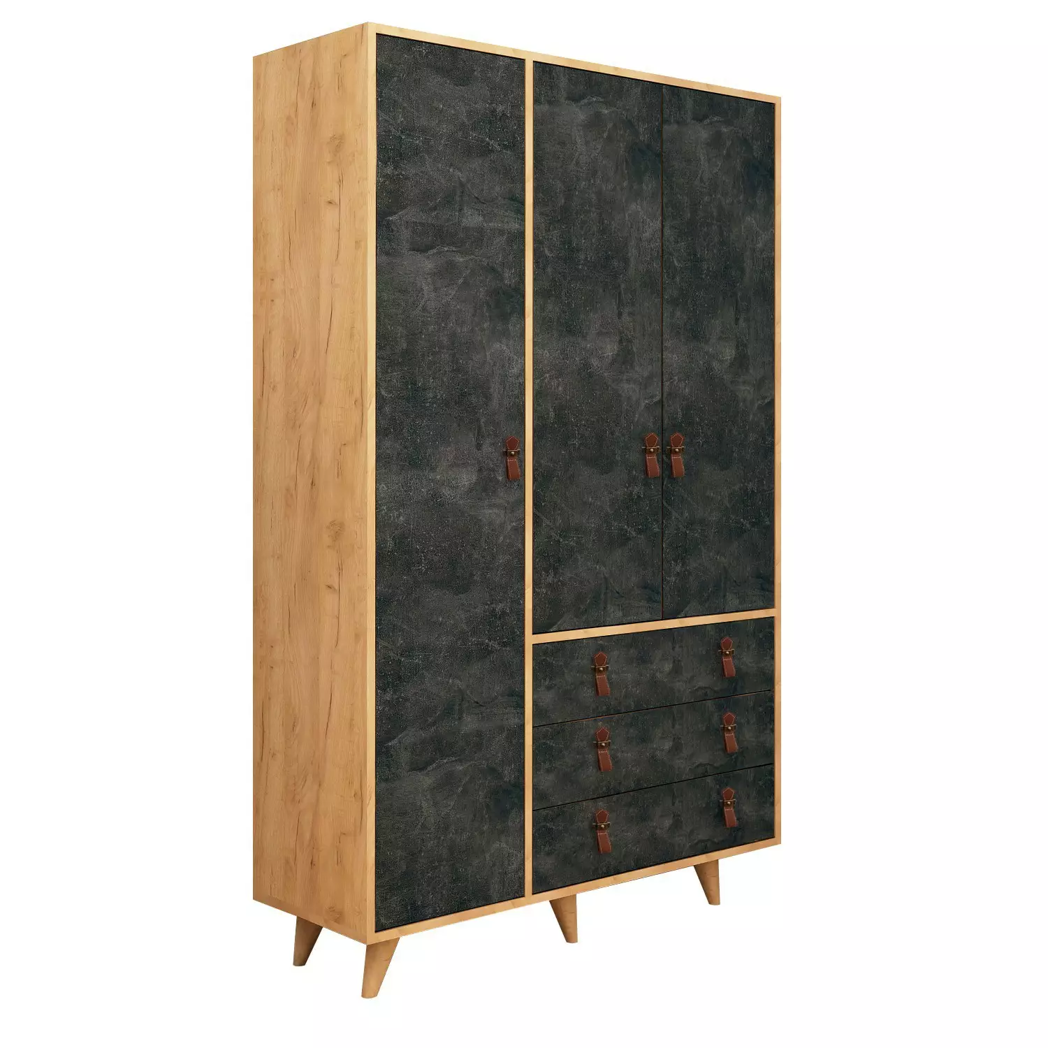 Med handtag i PU-läder och träben utstrålar denna garderob sofistikering och stil. Kombinationen av ek och mörkgrå färger ger en touch av elegans till alla rumsinredningar. De tre lådorna och många hyllorna ger gott om förvaringsutrymme för alla dina tillhörigheter och håller ditt utrymme organiserat och fritt från röran.