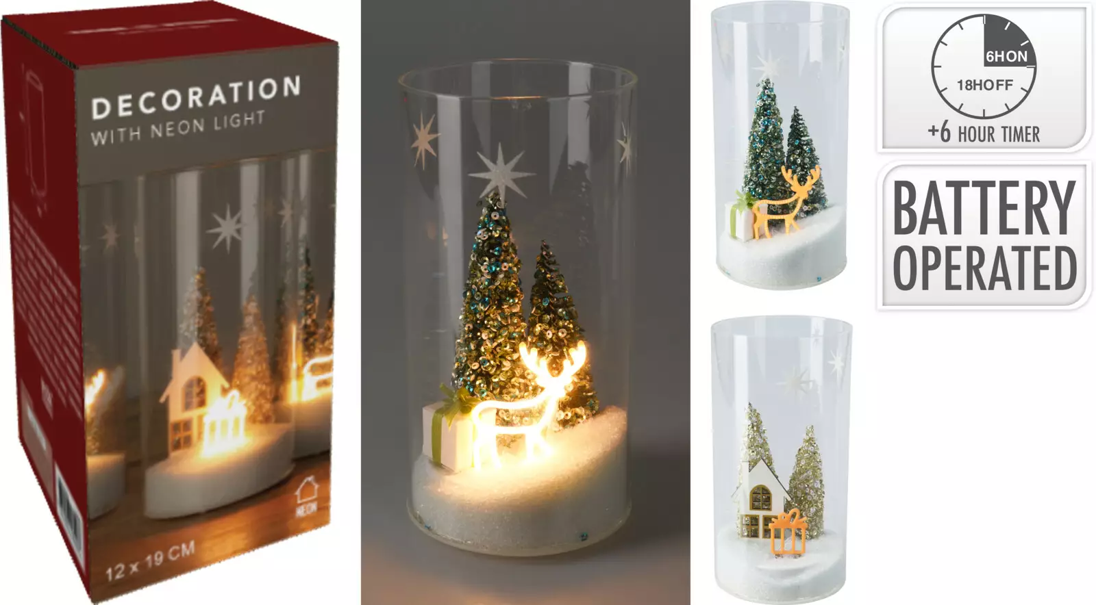 Glas cylinder med inre julgran scen och neonljus, skapar en festlig stämning i ditt hem. Cylindern kommer i två alternativa designer: ett hus med en present och en ren med en present. Cylindern har en timerfunktion som håller ljusen på i sex timmar och av i 18 timmar.