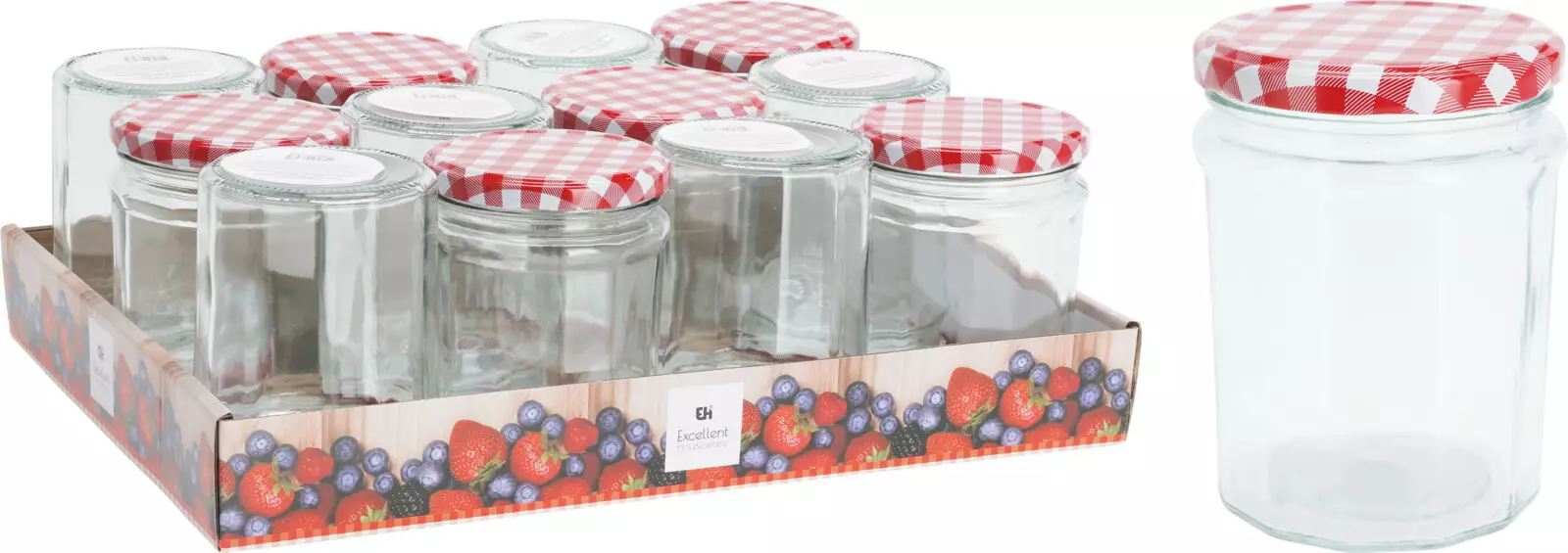 Glasburk, volym 450 ml, metallock med rödvitrutigt mönster. PE-ark på lockets insida. Burkens mått: diameter 87 mm, höjd 115 mm. Perfekt val för förvaring av sylt och andra konserver.