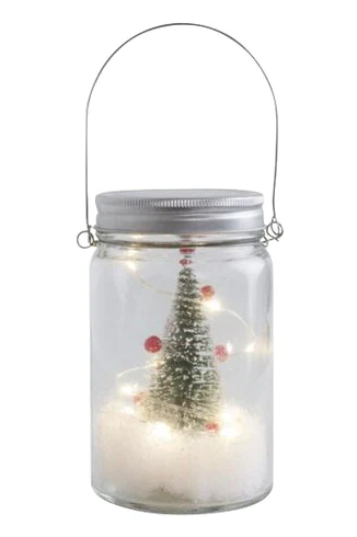 Inuti glasburken, en uppsättning LED-lampor och en vinterjulgran med dekorationer. En rolig present eller dekoration. Storlek Ø 8,5cm x 14cm. Led 10 st, varmvit, ej utbytbar. Batterier 3 x AAA, förpackningen innehåller inga batterier. Material glas och metall. På / Av knapp. Endast för inomhusbruk.