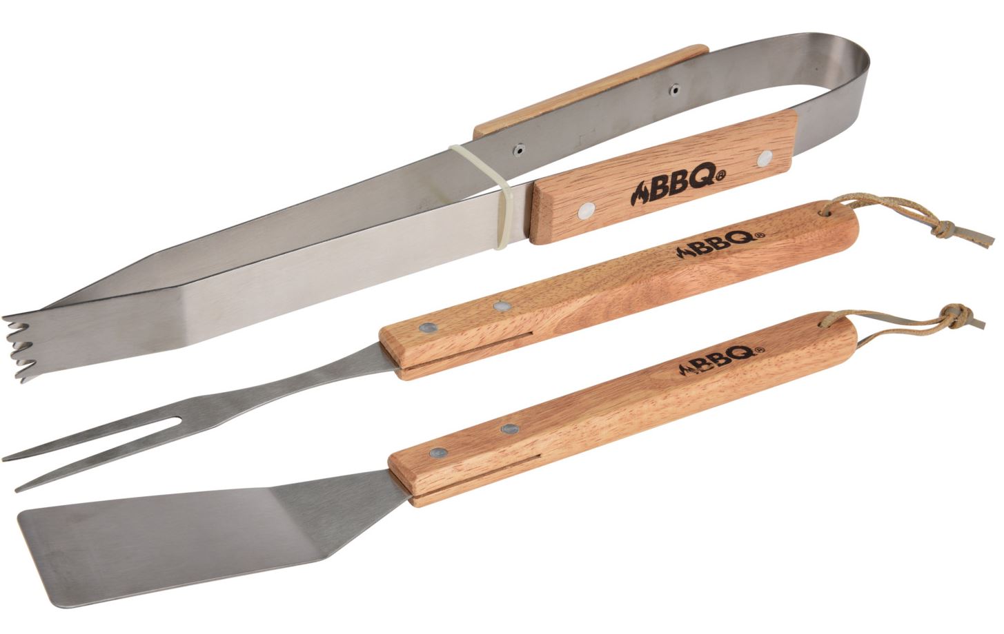 Setet innehåller en stekspade, stekgaffel och tång så att du kan sköta all mat på grillen med detta set! Trähandtaget ser till att dina verktyg inte blir varma.