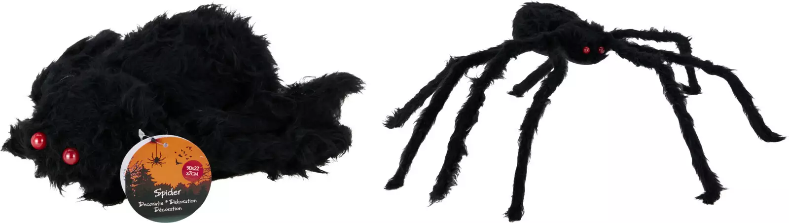 Skapa en äkta Halloween-stämning på din fest med en imponerande svart spindeldekoration! Denna 90 cm stora dekoration är tillverkad av mjuk polyester och PP-material, vilket gör den till ett lätt men imponerande tillskott till festlokalen. Spindeln väger endast 125 gram, vilket gör den enkel och smidig att placera.
