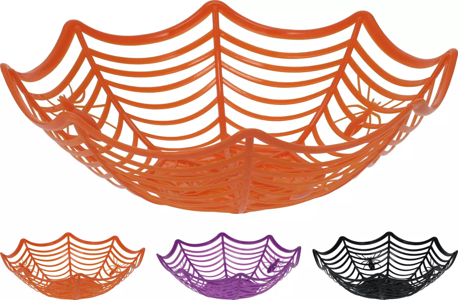 Ge dina fester en touch av magisk stämning med denna imponerande Halloween-dekorskål. Skålens öppna, runda form och spindelnätsliknande gallerstruktur gör den till en blickfångare för godis, små serveringar och dekorationer. Den vågiga kanten och de små spindeldekorationerna på insidan fulländar utseendet på ett roligt och tematiskt sätt.