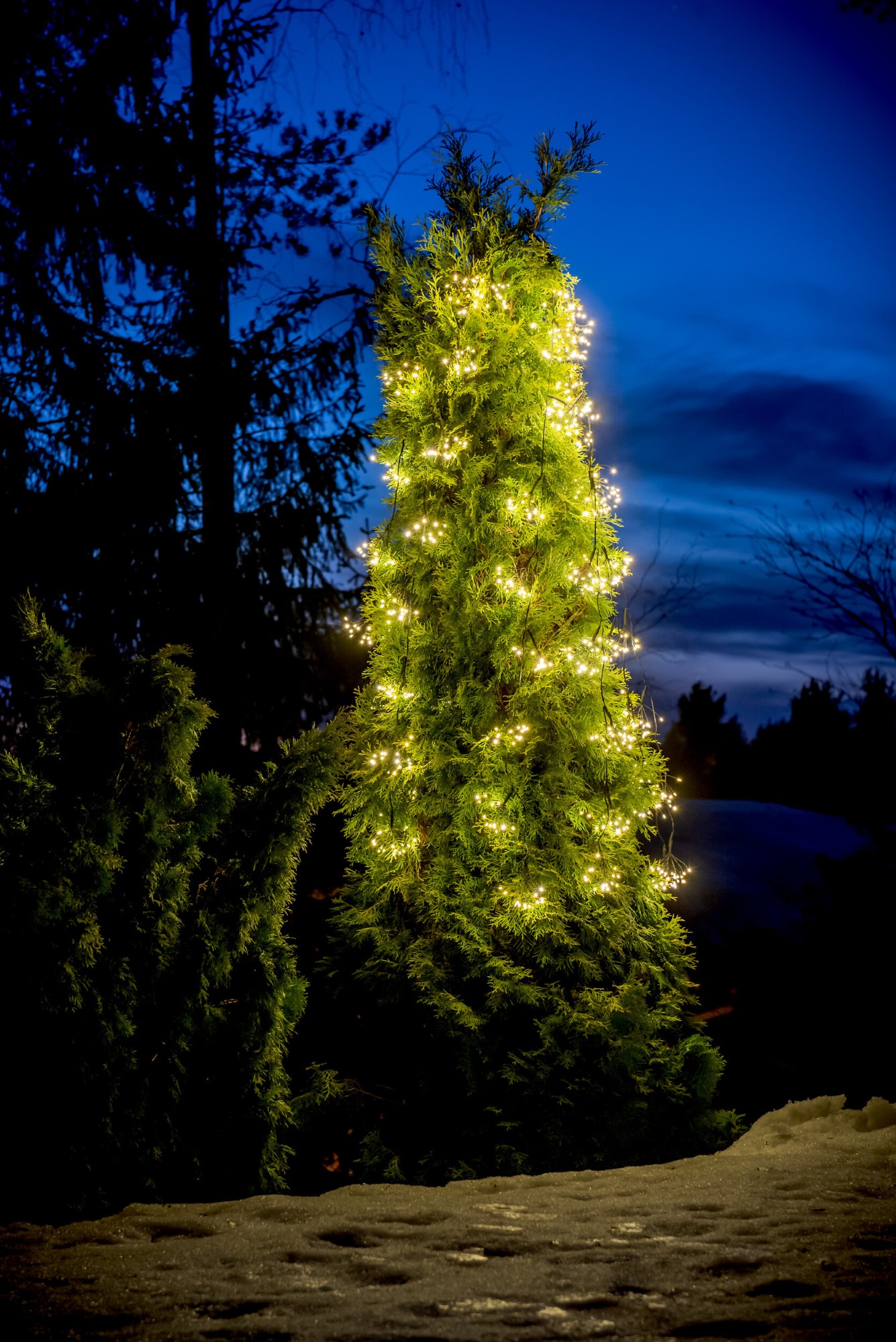 Den fantastiska ljuskaskaden är ett blickfång på din gård! En mångsidig och fantastisk ljusdekoration, som du kan hänga som den är på terrassen eller balkongen, eller så kan du arrangera ljuskaskaden som dekoration till exempelvis på ett träd på gården. Åtta 1,8 m långa ljuskedjor utgår från fästningsringen. Varje kedja har 15 varmvita LED-lampor med 20 cm mellanrum, sammanlagt 960 fantastiska ljusdroppar! Ljuskedjorna och LED-lamporna i dem kan arrangeras i önskad form, en kedja i taget.