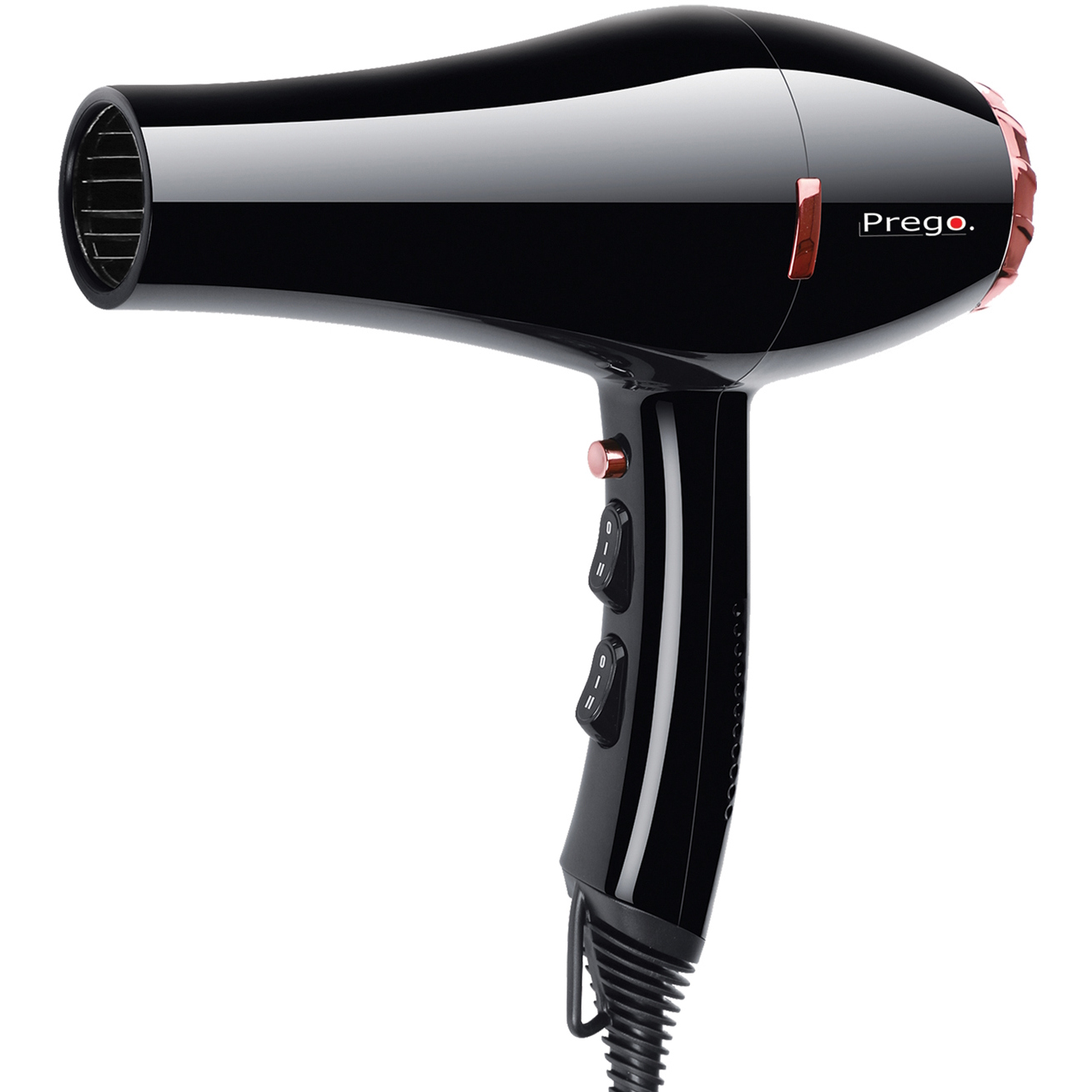 Prego 2300W Ionic hårtork ger en kraftfull och skonsam hårtorkningsupplevelse. Jonteknologi minskar statisk elektricitet och gör håret glansigt och slätt. Hårtorken har två hastigheter och tre temperaturinställningar samt kalluft för att fixera frisyren. Den har även en luftkoncentrator, 1,7 meter lång sladd och en praktisk upphängningskrok som gör användning och förvaring enkel.