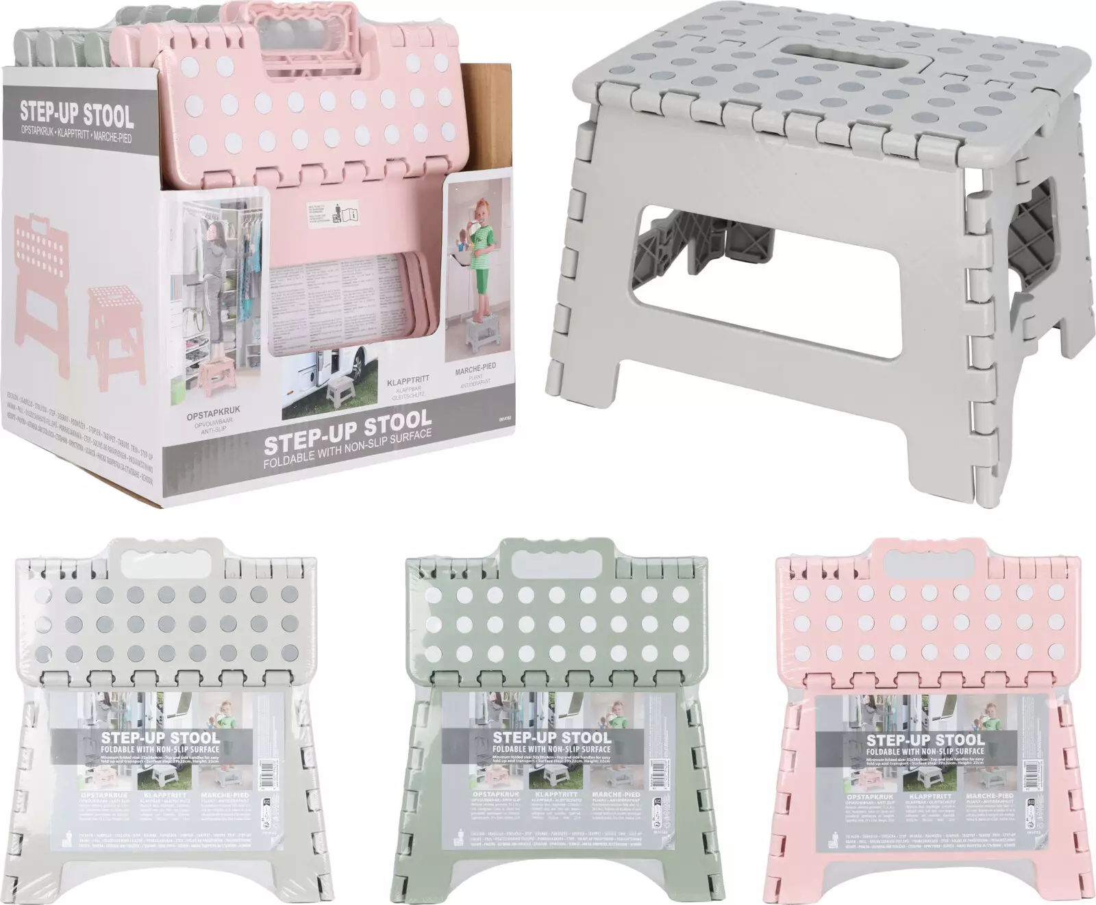 Hopfällbar pall, rosa/grå/grön, med bärhandtag, EN14183 godkänd, max 150 kg