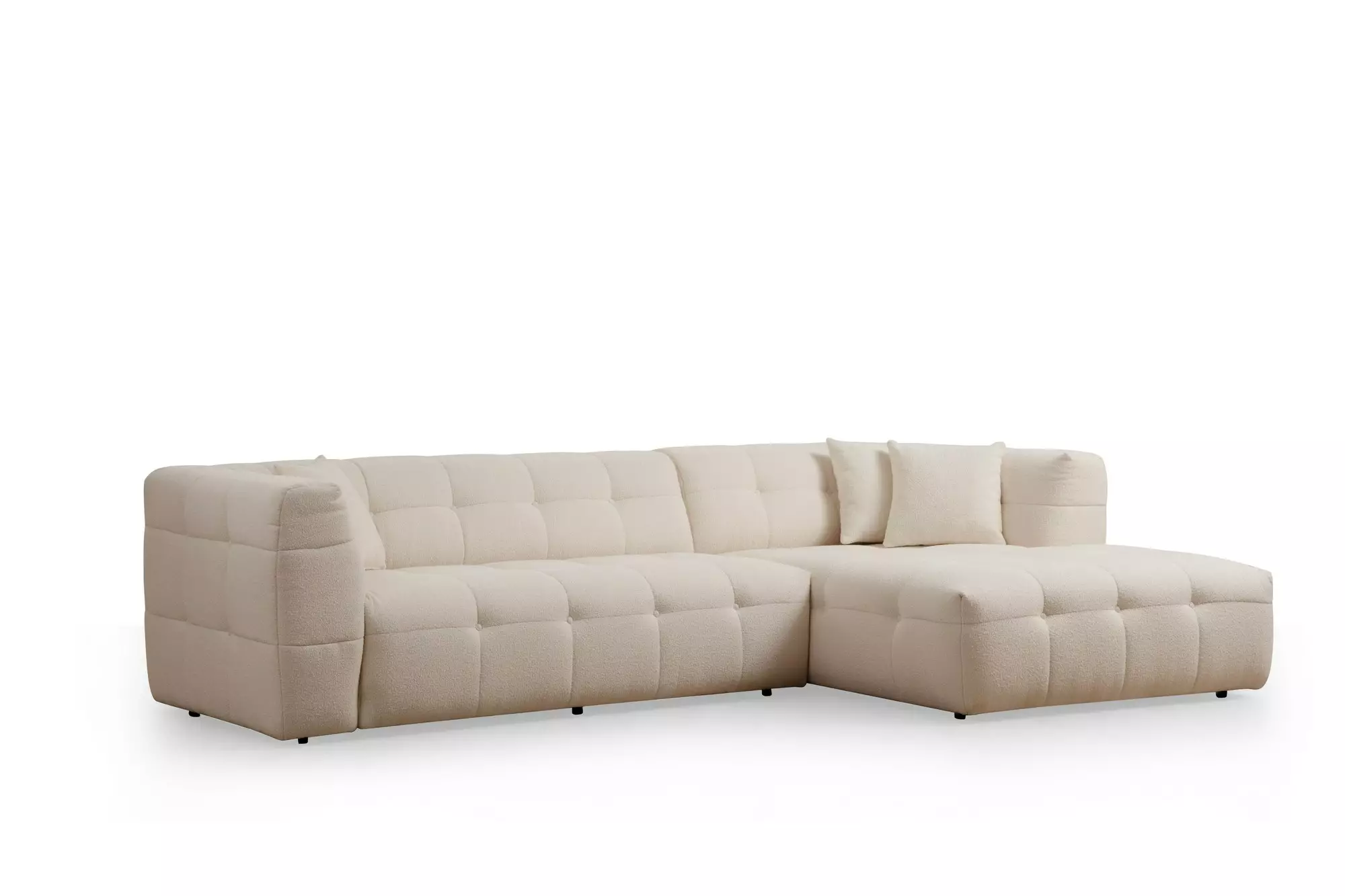 Lägg till en touch av elegans i ditt hem med vår hörnsoffa. Den eleganta designen och den tidlösa beige färgen smälter enkelt in i alla inredningar, vilket gör den till ett mångsidigt val för alla rum. De små svarta plastbenen ger inte bara stabilitet utan lägger också till en modern touch till den övergripande estetiken.