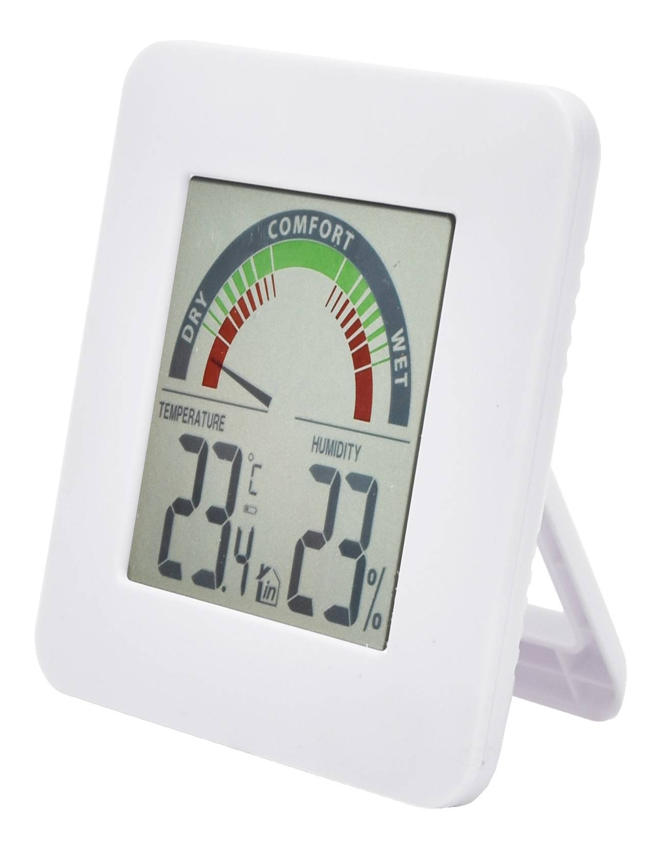 En hemtermometer med, förutom inomhustermometer, inomhusluftfuktighet och klockfunktioner.
