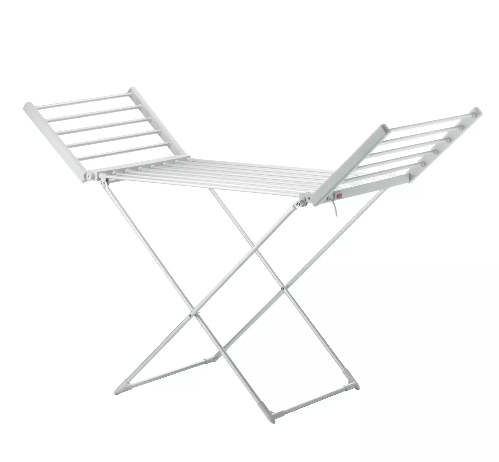 Robust torkställning med vingar och värmemotstånd. Värmen från motstånden gör att tvätten torkar extra snabbt. Ett praktiskt hjälpmedel, särskilt för småhus och flerfamiljshus utan separat tvättstuga eller annat utrymme för torkning av tvätt. Det går mycket snabbare att torka tvätten, kläderna torkar bättre och du kan få upp ställningen från golvet snabbare utan att ta upp plats.