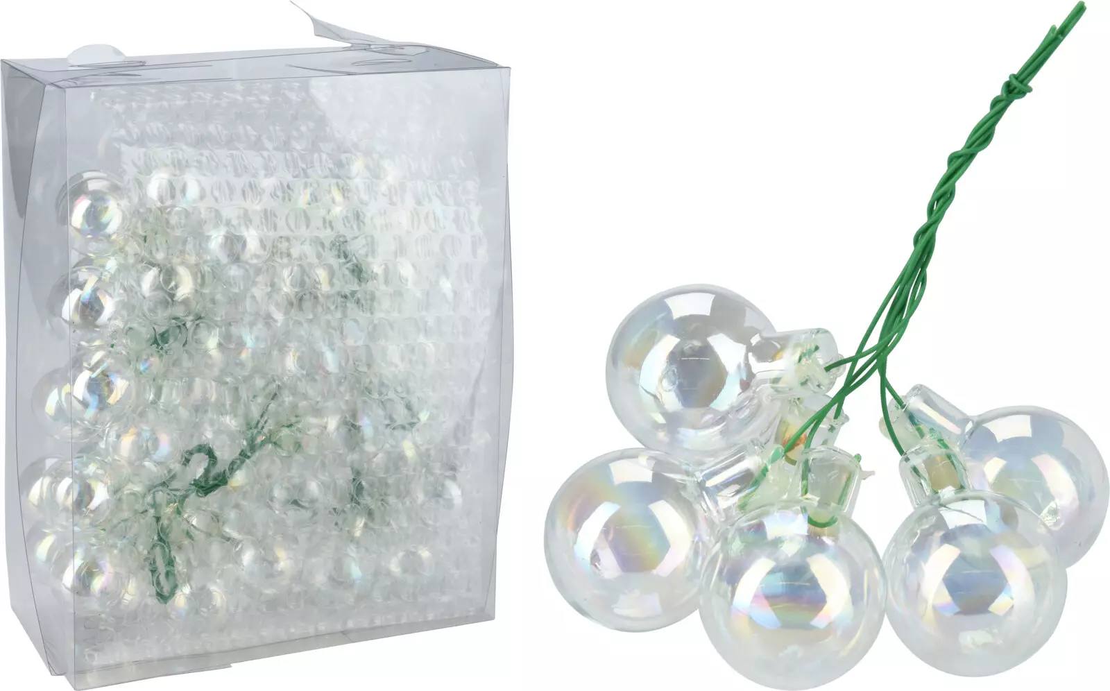 Iridescerande glaskulor på metalltråd skapar ett mjukt, glittrande ljus. Ett elegant val för julgranen, fester och heminredning.
