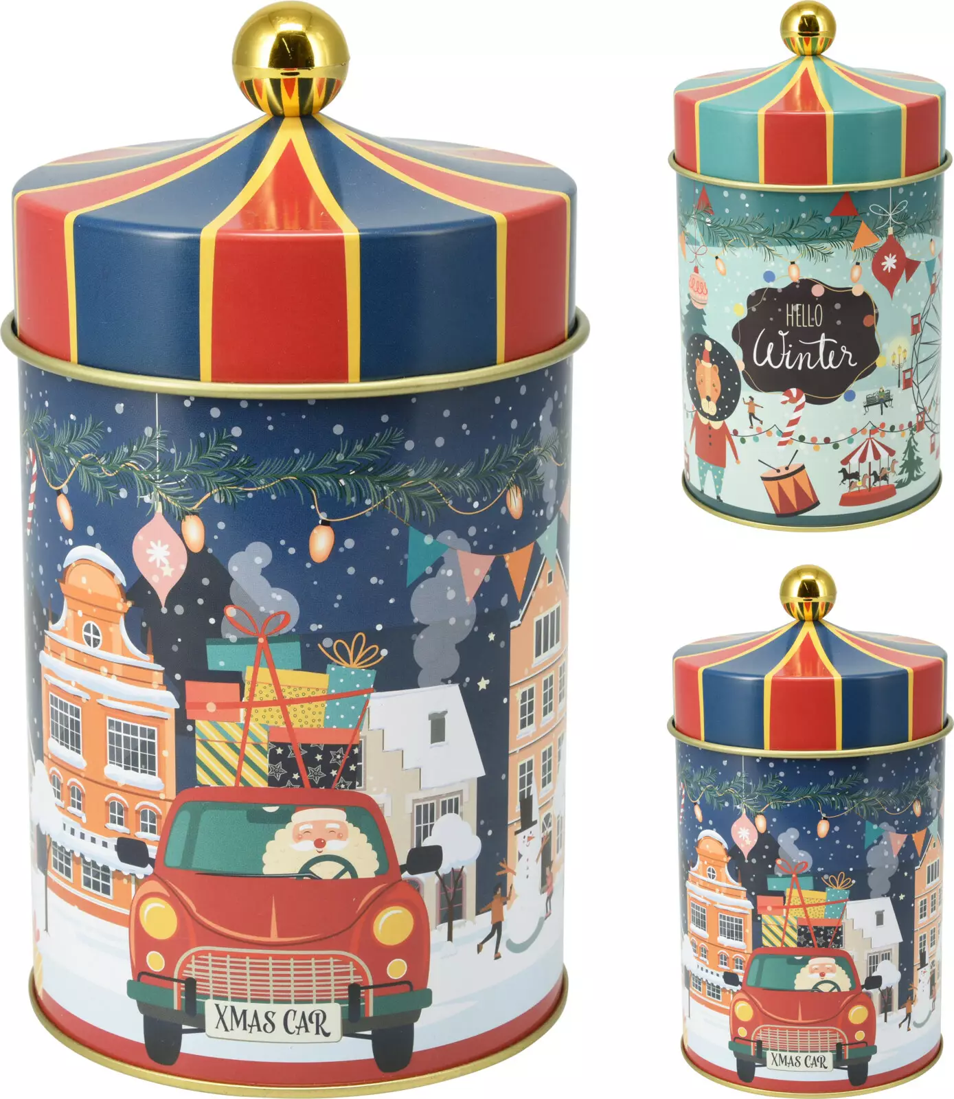 Dessa stiliga metallförvaringsburkar ger hemmet en touch av julstämning och praktisk funktion. Varje burk är tillverkad av hållbar metall och färdigställd med detaljerade, färgrika vintermotiv. Burkarna passar perfekt för förvaring och presentation av till exempel kakor, godis eller små gåvor.