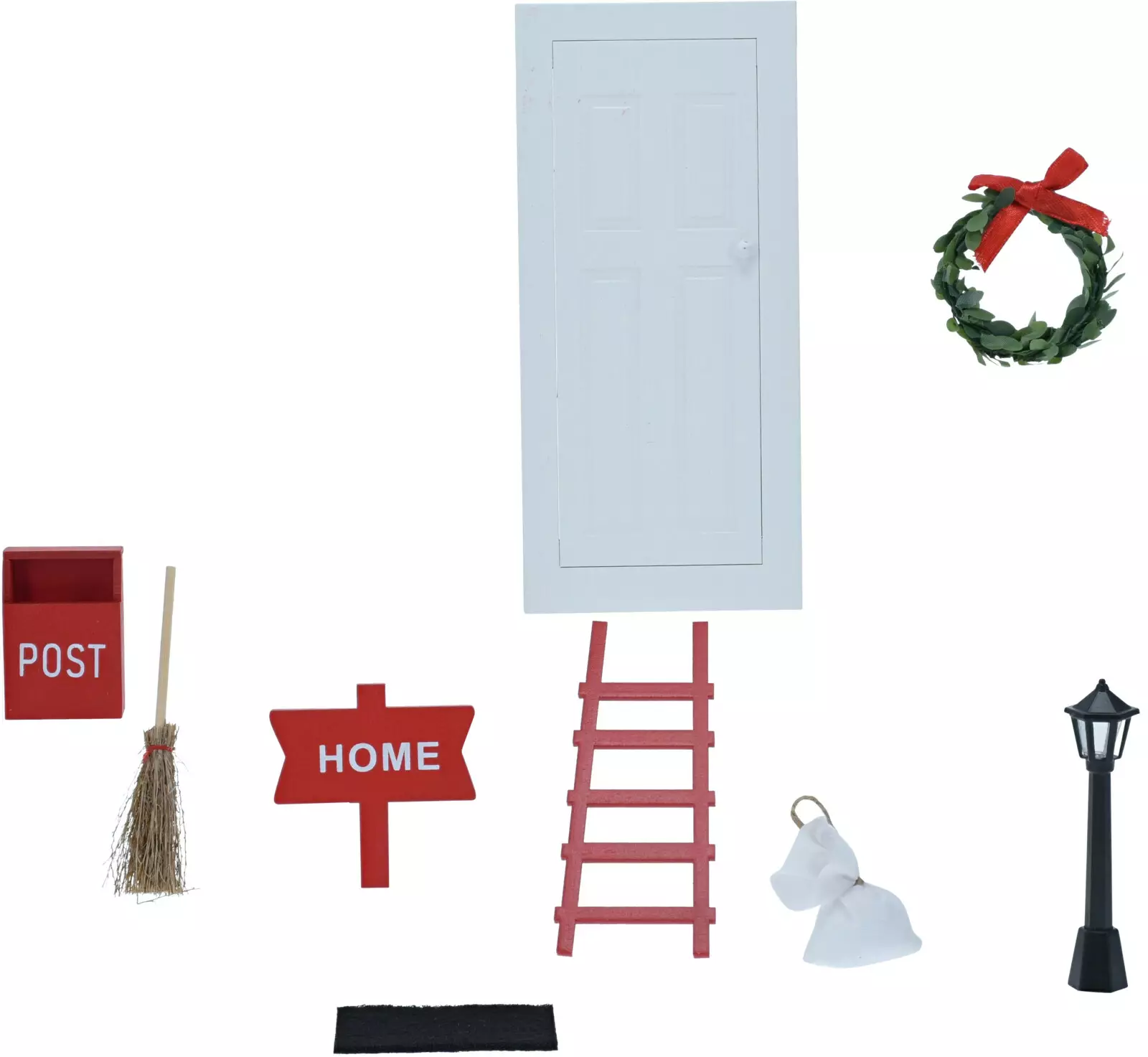 Skapa en magisk julstämning i ditt hem med detta detaljerade 9-delade julscenset. Setet innehåller en vit dörr, en röd stege, en röd skylt med texten “HOME”, en röd brevlåda med texten “POST”, en liten borste, en svart dörrmatta, en grön krans med röd rosett, en svart gatlykta samt två små vita tygpåsar. Varje del är noggrant bearbetad och utformad för att ge värme och en traditionell julkänsla till din miniatyrvärld.