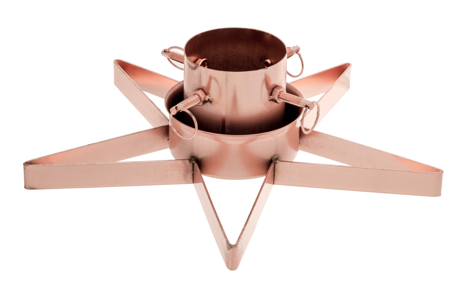 En vacker stjärnformad kopparfärgad julgransfot i metall.