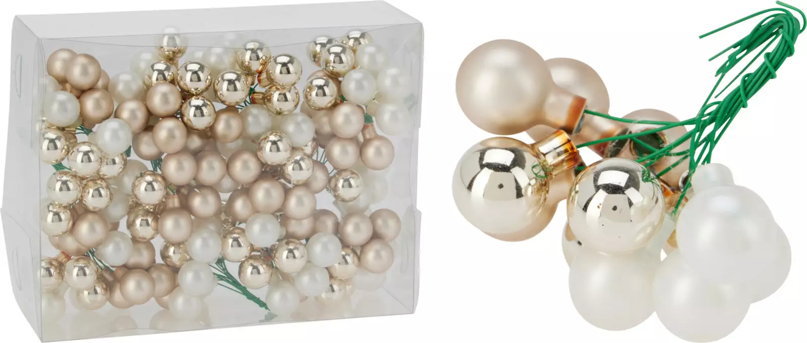 Skapa feststämning i ditt hem med dessa eleganta miniatyrjulgranskulor. Setet innehåller 12 kulor av glas med en diameter på 20 mm. Kulorna är fästa på en grön metalltråd, vilket gör dem lätta att forma och fästa till exempel i kransar, granen, girlander eller bordsdekorationer.