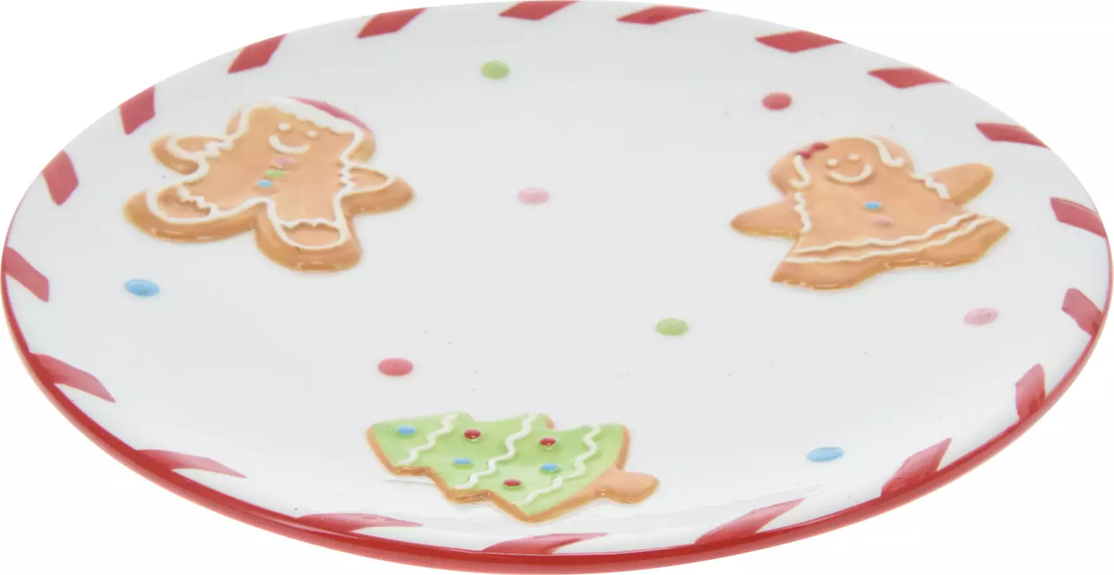 Det runda, krämfärgade fatet är dekorerat med upphöjda pepparkaksfigurer och en julgran. De traditionella julfärgerna och den rödvita kanten påminner om söta polkagrisar och skapar en glad och varm atmosfär. Varje detalj är noggrant utförd, vilket gör fatet till en iögonfallande del av juldukningen.
