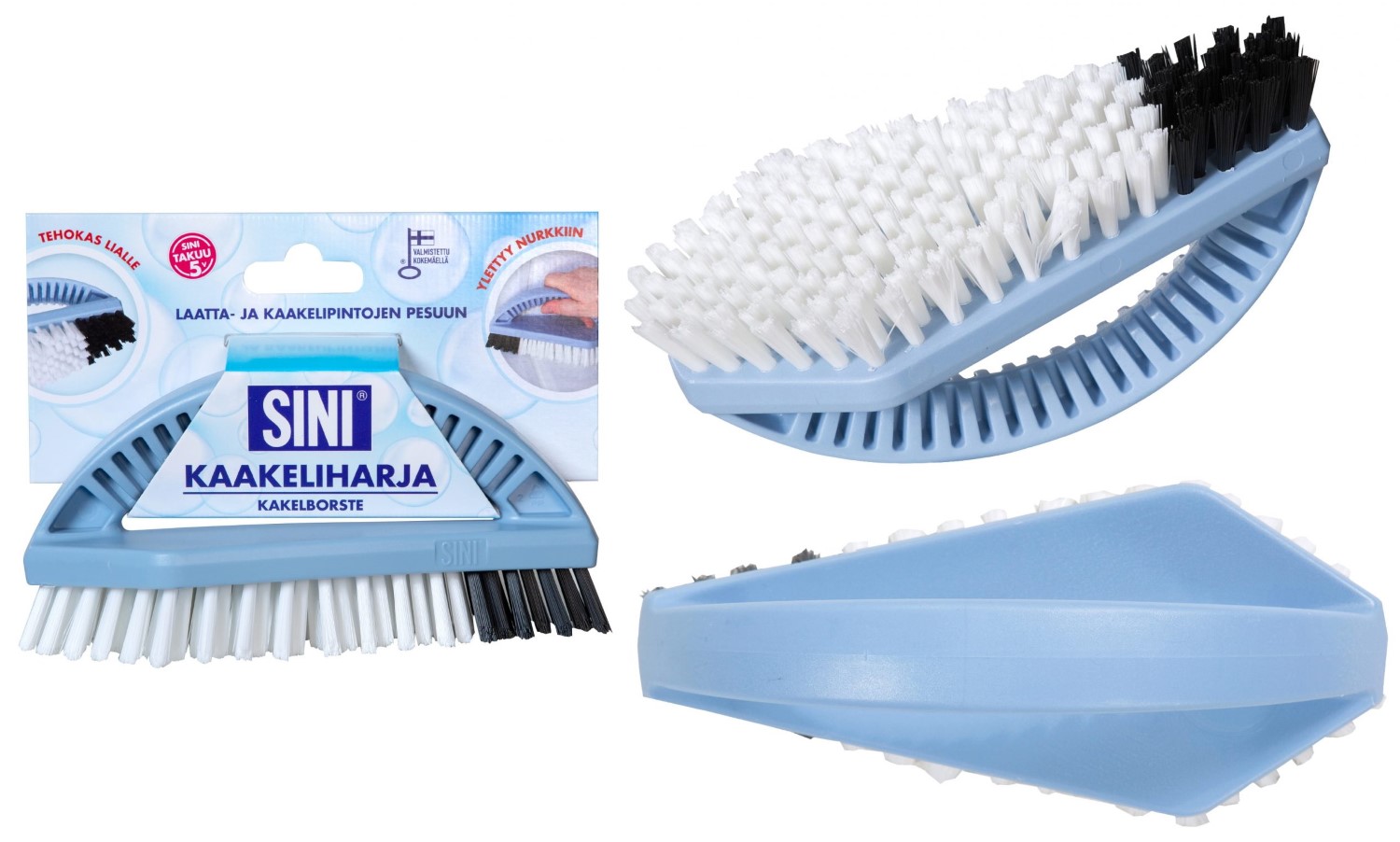 Kakelborsten har ett stadigt handtag för ett bra grepp. Borstens sluttande borst når hörnen och kanterna bra. Den robusta borsten tar effektivt bort smuts och tvättmedelsrester från kakelytan. Spetsen på borsten har ett grövre svart borst.