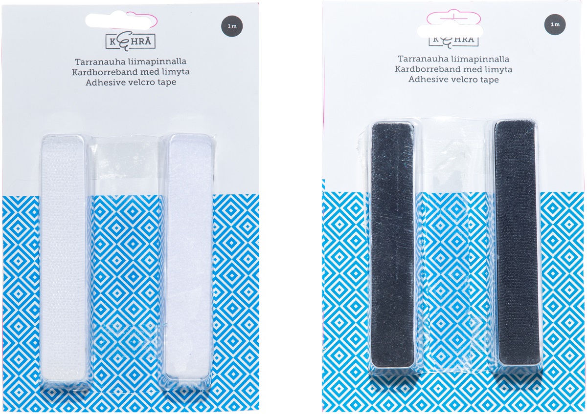 Förpackning med 2 st / 1m mjuk och grov kardborre-remsa. Remsorna fäster ihop starkt. Självhäftande yta på baksidan av varje remsa. Finns i svart och vitt.