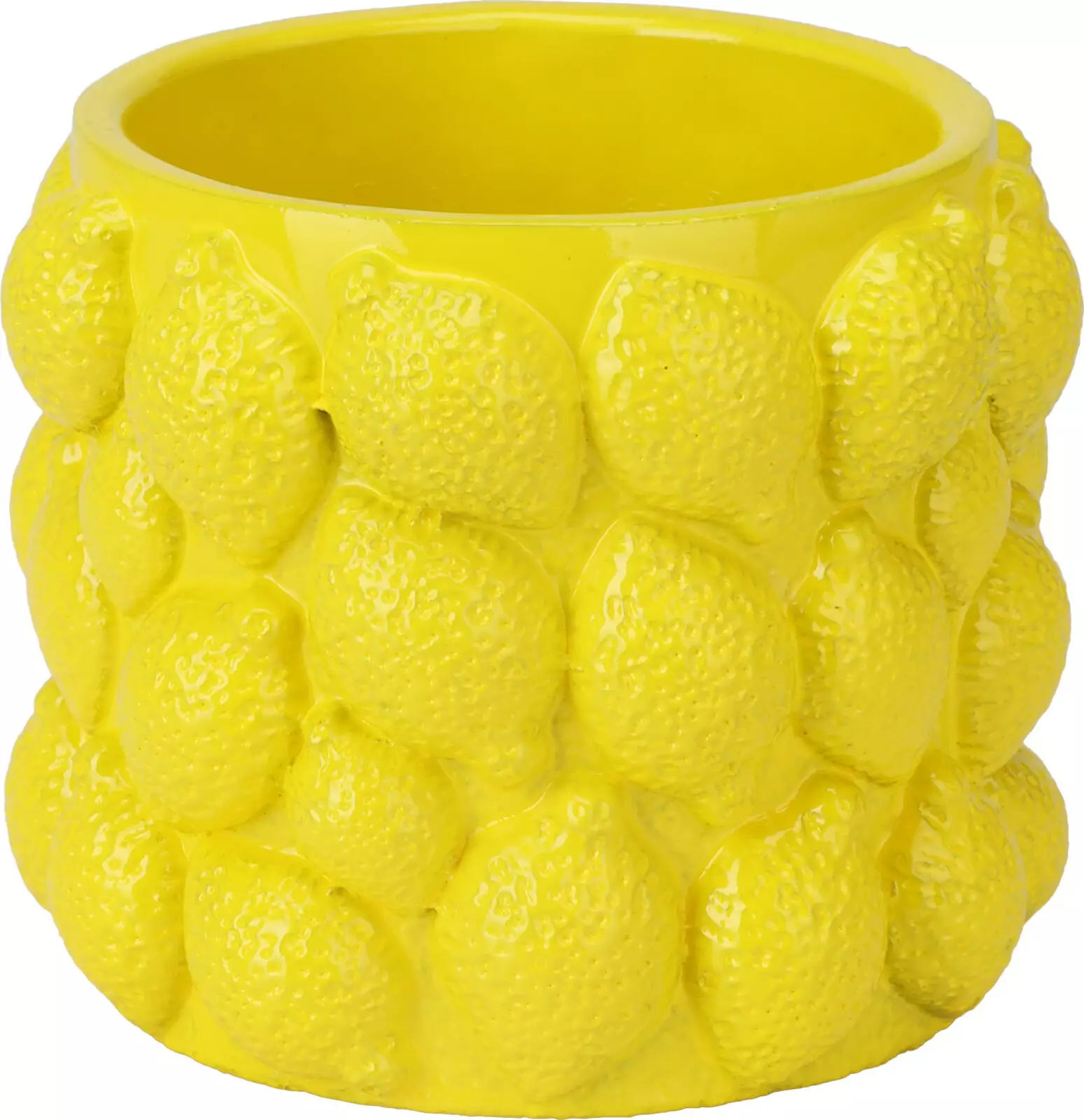 Keramisk kruka med upphöjda citroner ger en fräsch look till inredningen. Den blanka gula ytan och livfulla designen gör den till ett utmärkt val som dekorativt element eller för plantering av växter. Krukans mått är 145x145x120 mm och den är tillverkad av hållbar cement. Ett perfekt val när du vill lägga till en pigg färg och elegans till rummet.