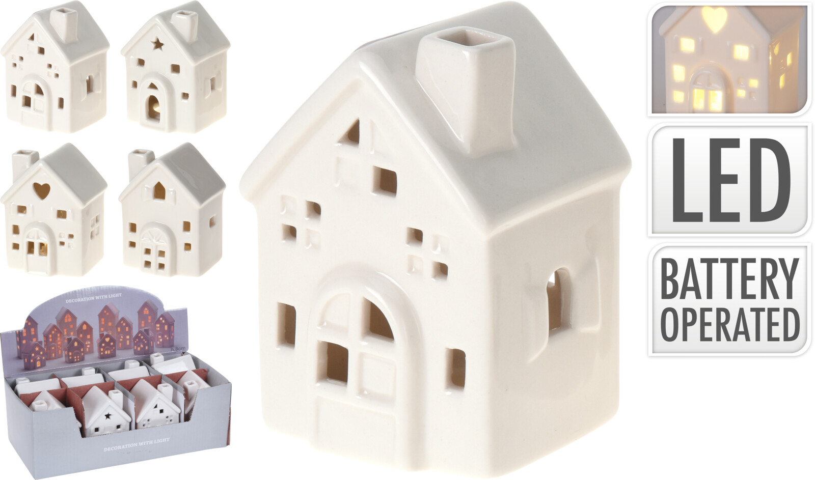 Keramiskt sött litet hus med varmt led-ljus.