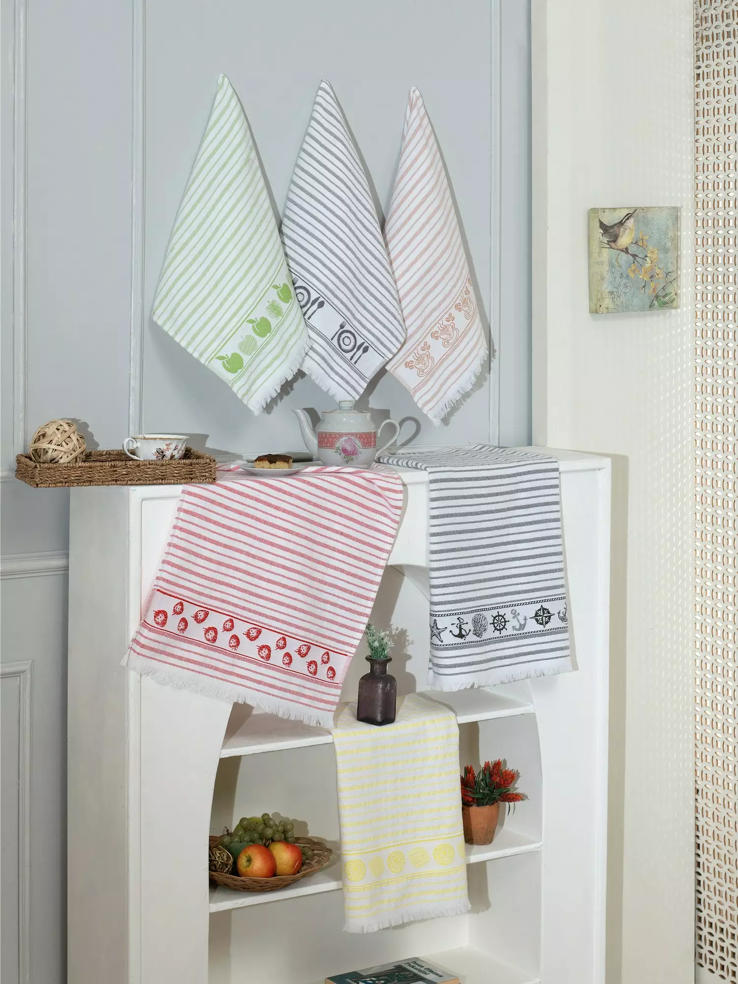 Kökshandduk Set Hermia Vit Grå Grön Orange Röd Bomull 6 Delar