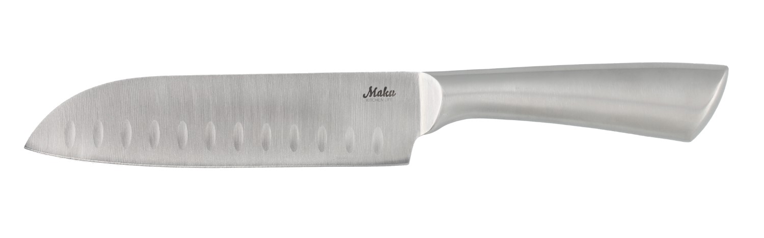 En bra universalkniv för många typer av skärning och hackning. Oval slipning minskar vidhäftningen av råmaterial till bladets yta.