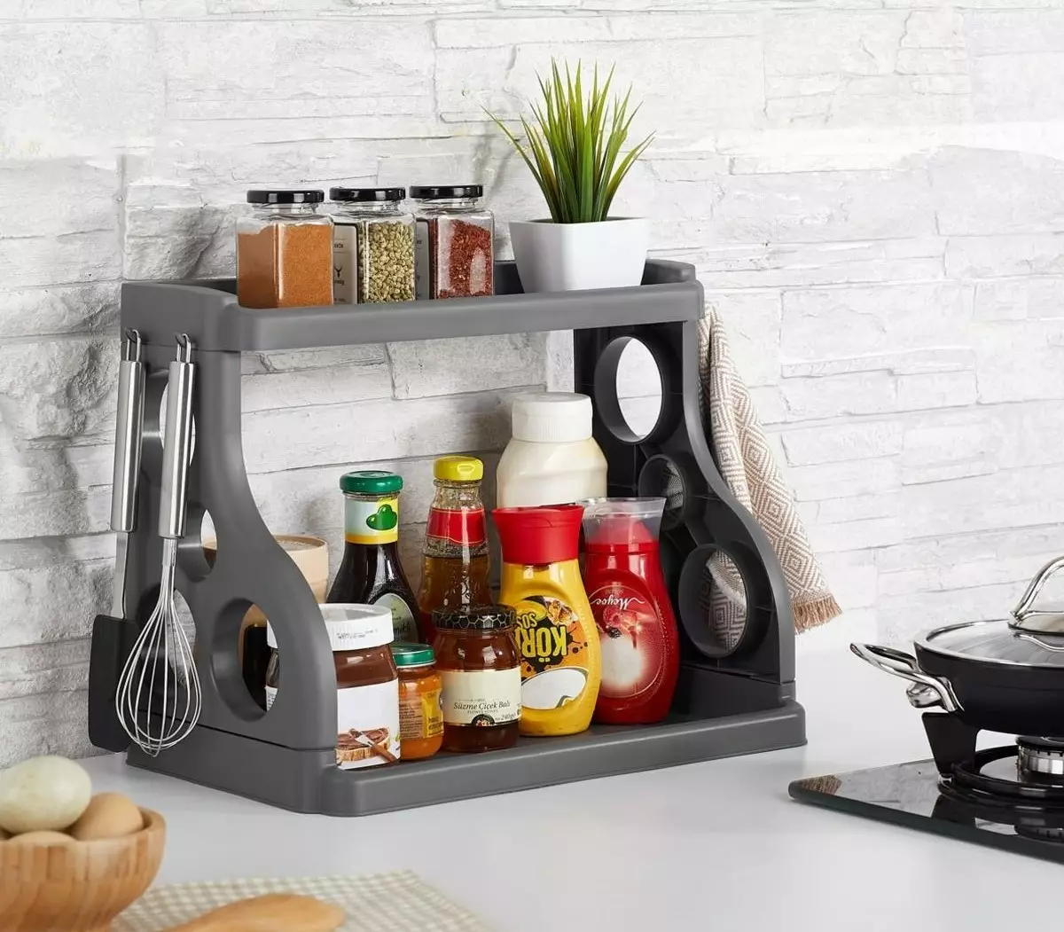 Den grå färgen på denna organisatör kommer att komplettera vilken köksinredning som helst och tillföra en touch av elegans till ditt utrymme. Håll ditt kök prydligt och stiligt med denna oumbärliga organisatör.