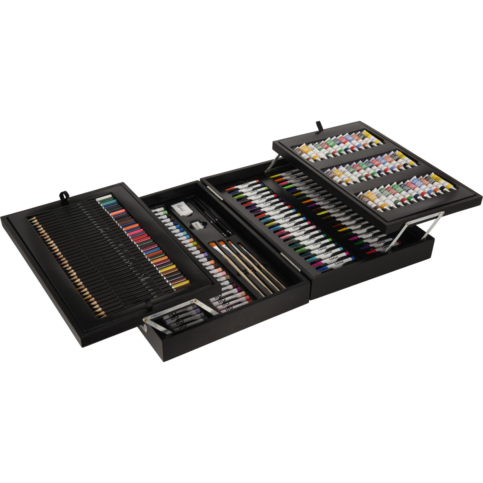 174-delars konstset i elegant trälåda. Innehåller färgpennor, oljepasteller, akrylfärger, vattenfärger, oljefärger, tuschpennor, grafitpennor och tillbehör.