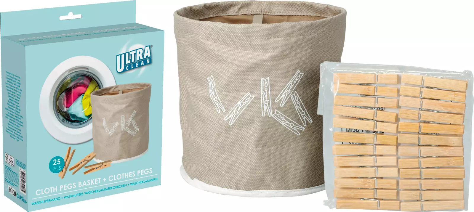 Ultra Clean pyykkikorg med 24 klädnypor – beige tyg, 18 x 17 cm