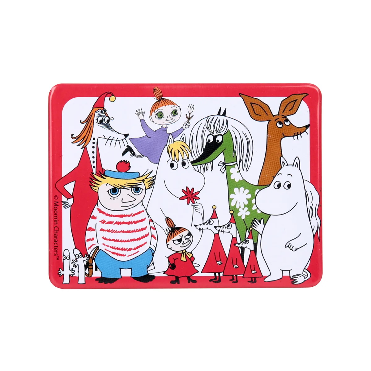 Härligt fräsch kylmagnet, finns fyra olika. De rektangulära magneterna är illustrerade med färgglada Mumindalen-karaktärer och har röda rundade kanter och en vit grundfärg. Till ditt eget hem eller som present till en Muminfantast.