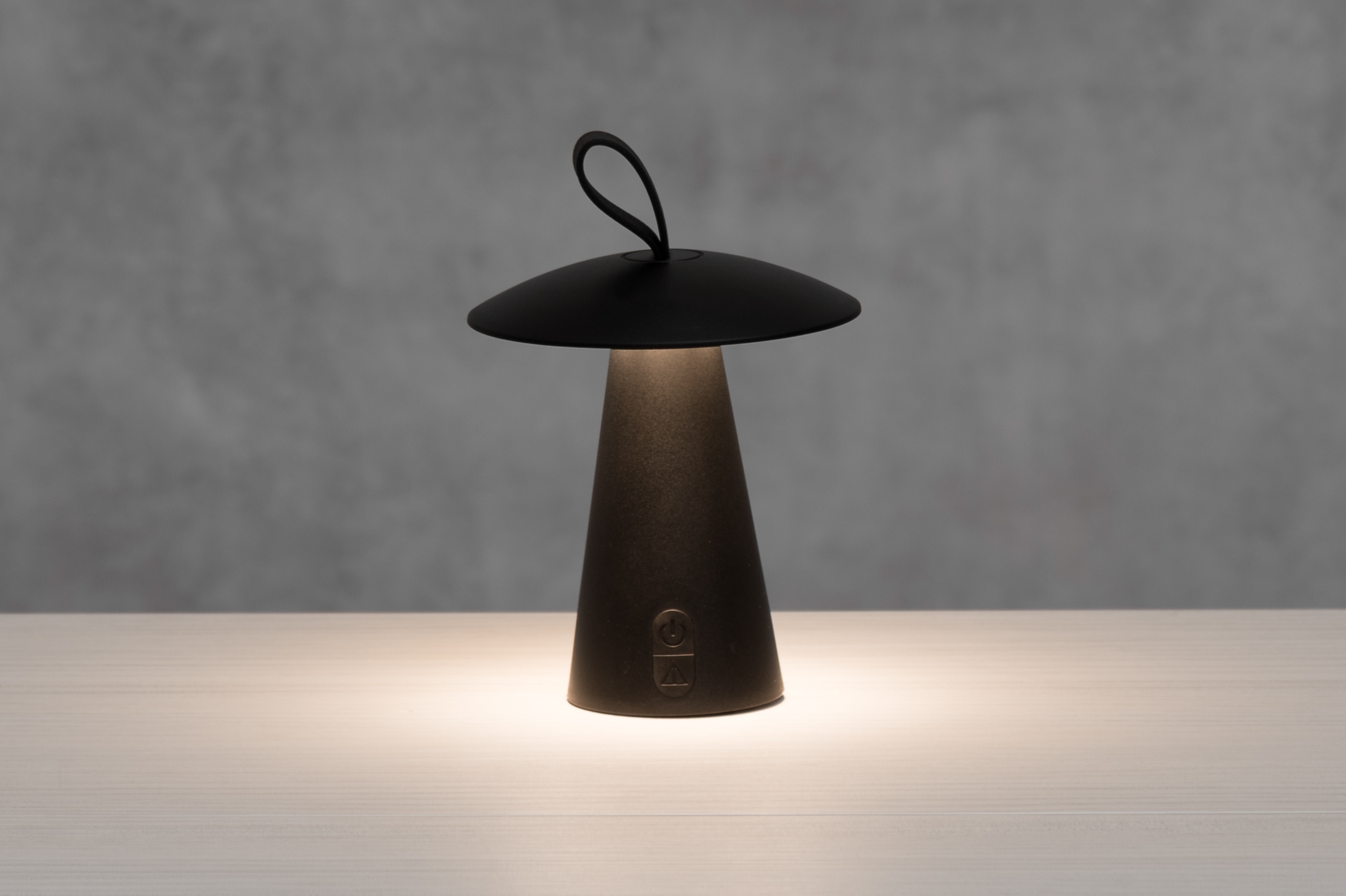 Batteridriven svampformad LED-lampa. Lampan kan placeras på ett bord eller hängas i hängslingan ovanpå lampan.