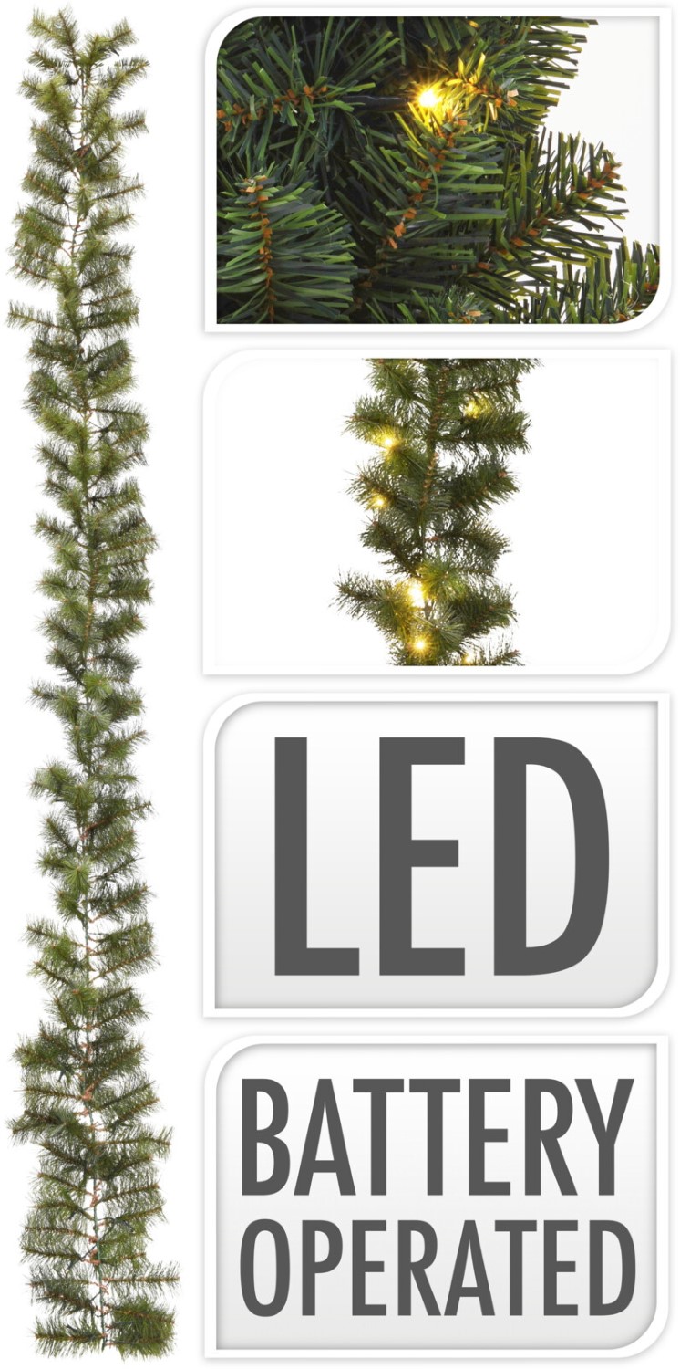 Girlang "julgran" med belysning och längd på 270 cm. Perfekt för fönsterbrädan, skorstenen eller trappans räcke. Med en automatisk timer som stängs av automatiskt efter 6 timmar varje dag.