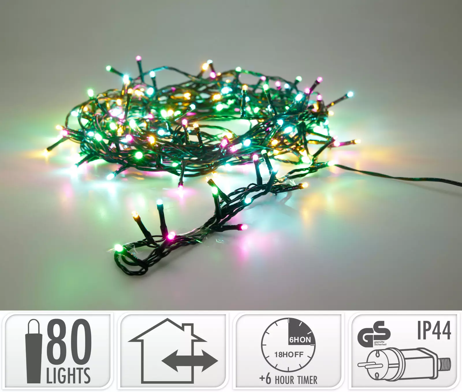 Skapa ett glatt och stämningsfullt ljus i ditt hem eller trädgård med denna flerfärgade LED-ljusslinga. 80 klara macaronfärgade LED-lampor (grön, orange, blå och rosa) ger en fräsch och energisk look till sin omgivning. De små 5 mm cylindriska LED-lamporna sprider ljuset jämnt och skapar en inbjudande atmosfär både till vardags och fest.