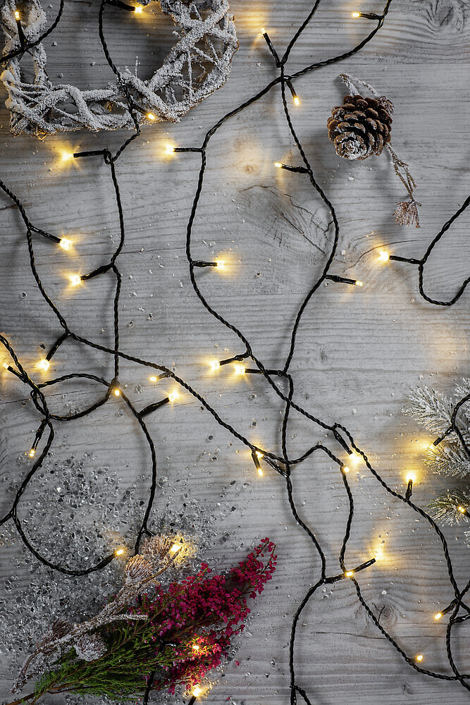 LED-serie med mörk sladd lämplig för utomhusbruk.