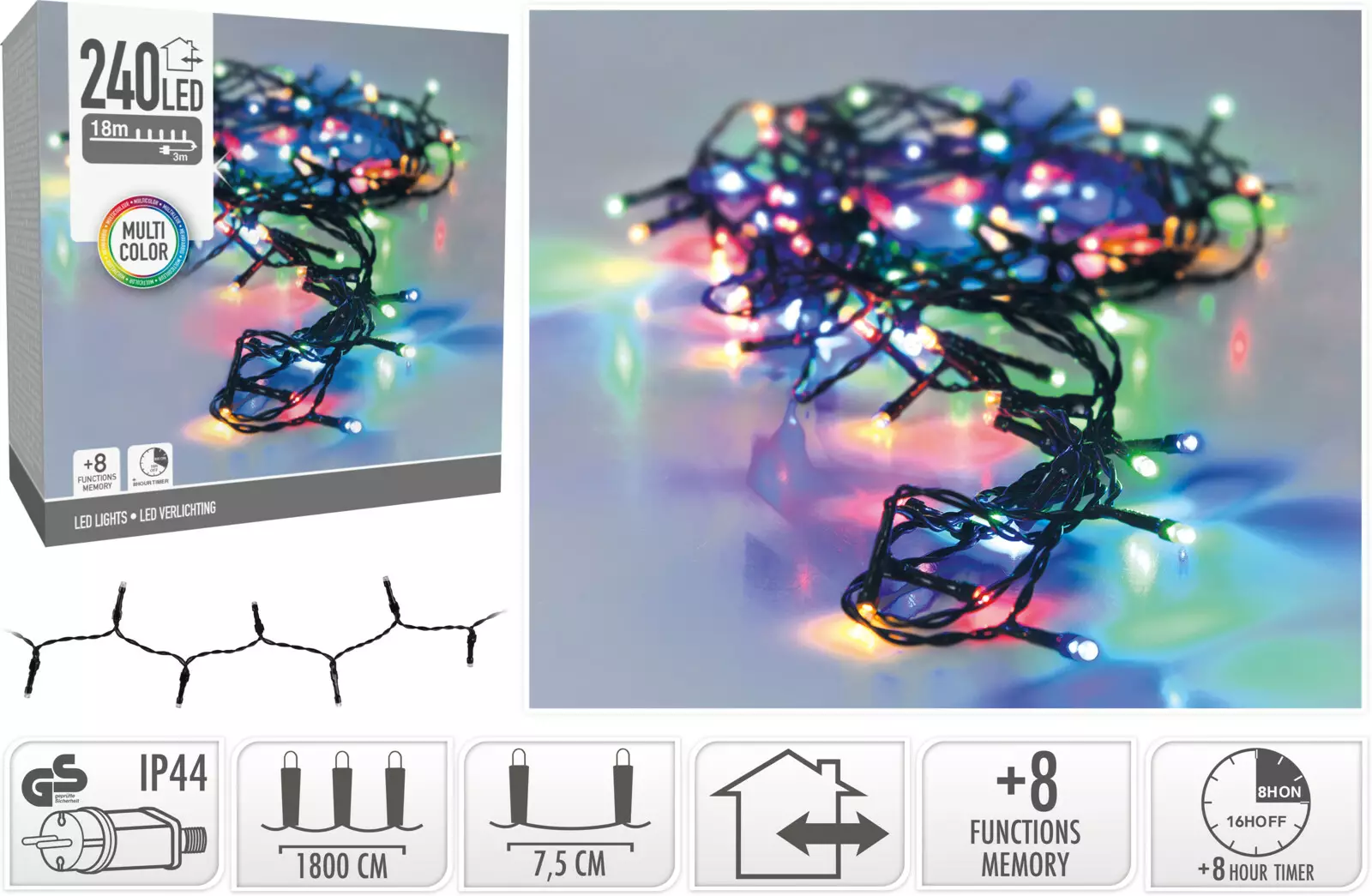Flerfärgad LED ljusslinga för utomhusbruk med 240 LED-lampor lyser upp ditt utomhusområde med färgstarka toner. Sladden är grön och 3 meter lång. Avståndet mellan lamporna är 7,5 cm. Utrustad med en 8-funktionskontroll med minnesfunktion, IP44-klassad elektronisk adapter och CE-godkänd. Timerfunktion (8 timmar på/16 timmar av). Förpackningen är FSC-certifierad.