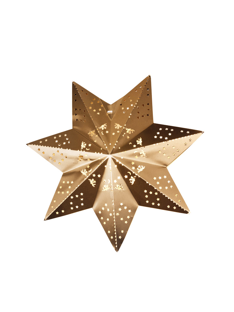 Mässingsfärgad metallstjärna som lyses upp av en LED-ljusslinga. Varmgula LED-lampor, ej utbytbara, kopplade i serie om tio lampor. Material: metall. Genomskinlig sladd.
