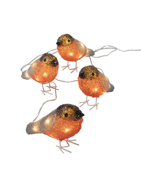 En vacker uppsättning lampor med fyra stora domherrar som står stadigt på egna ben. Till exempel på en fönsterbräda, gren eller gårdsräcke, lämplig för både inomhus och utomhus. Klar sladd, fågelhöjd 10,5 cm och längd 16 cm.